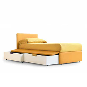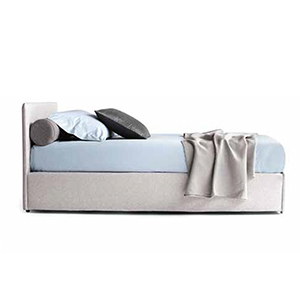 Double Space Due, la cui identità risiede nel gioco degli opposti che governano il mondo: il giorno e la notte, il maschile e il femminile, il buio e la luce e in tanti altri elementi che si contrappongono ma non sono nulla l’uno senza l’altro. Double Space Due prende la forma di un sommier con l’aggiunta di una sponda. È già “letto” in versione minimale, adatto alla cameretta per ragazzi, per single che amano l’eleganza della semplicità e per chi dispone di spazi contenuti.