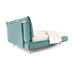 Duck rappresenta un perfetto equilibrio tra minimalismo e comfort. La sua testiera, alta e generosamente imbottita, crea un senso di protezione e definisce con eleganza l’ambiente notte. Le cuciture a vista lungo i bordi della testiera aggiungono un tocco di artigianalità mentre la base del letto, compatta e completamente rivestita, avvolge il materasso in un abbraccio. I piedini, quasi impercettibili, sollevano la struttura quel tanto che basta per conferire leggerezza visiva senza compromettere la solidità.